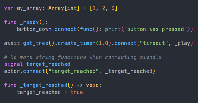- Functions as first-class citizens. You can now assign functions to variables, pass them as arguments and more (lambdas and Callables). With this, GDScript now also has proper functional capabilities, such as map and reduce.