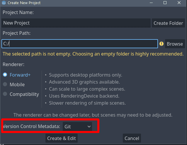 The Godot Project Manager automatically adds the required Git metadata to set up a new Godot project as a Git repository.