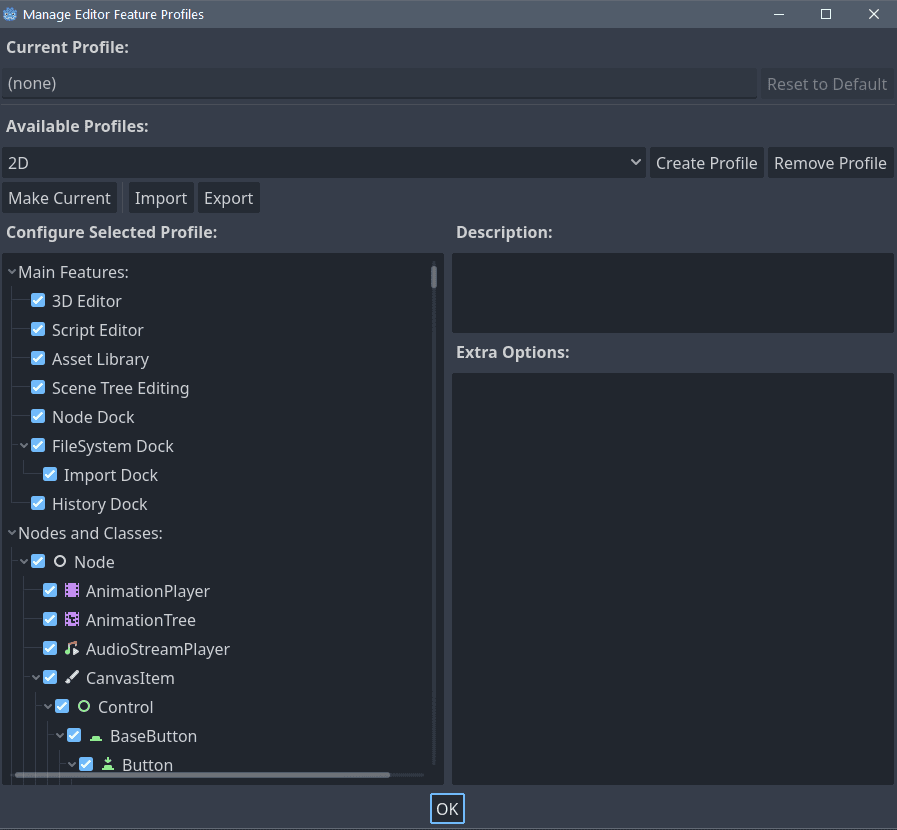 It's now possible to customize the editor by toggling features from the Editor and the Engine. For example, if you are making a 2D game, you may want to disable all 3D features.