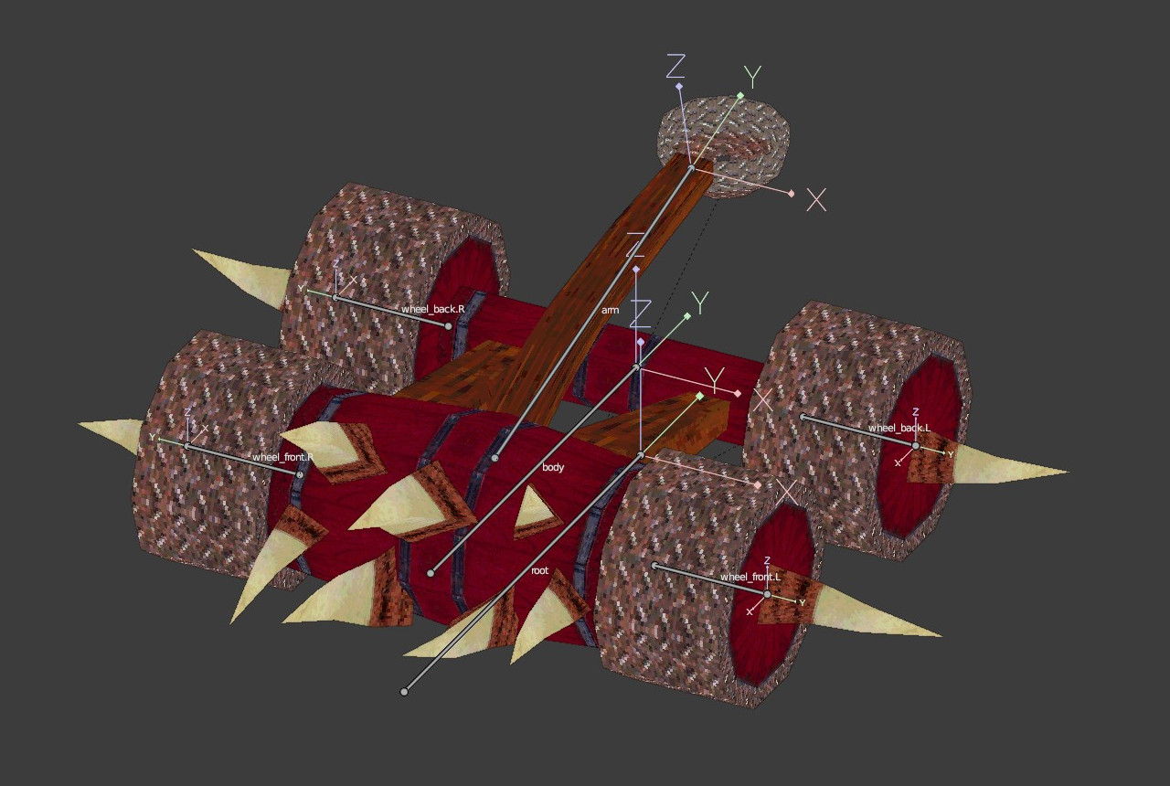 - Each object (wheel, spike, body, arm and basket) were separate, with their own UV map and material. I parented them to the body, but still, they are not joined, only parented.