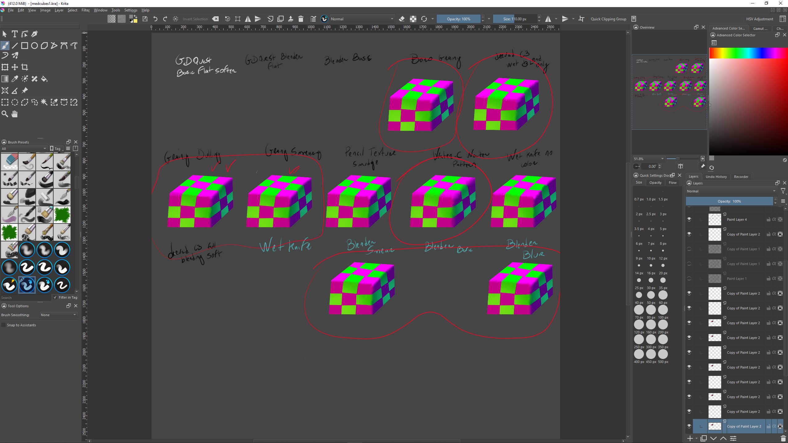 I also experimented with every Blending and Mixing brush I had in Krita (see process image) in order to decide my favorite one. Turns out, there are many – which is bad, it can cause me confusion when painting later.