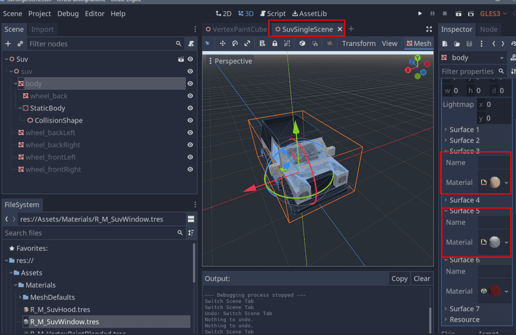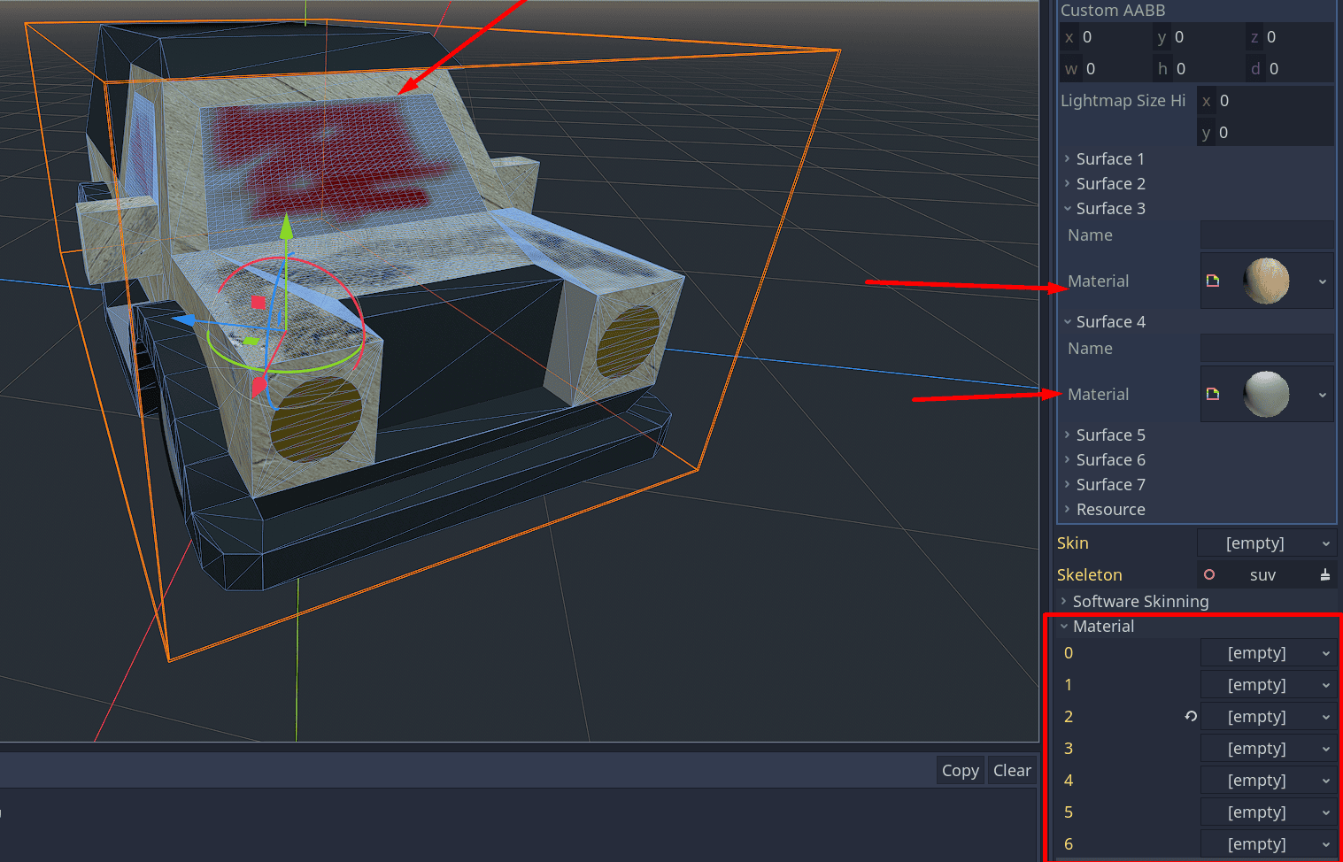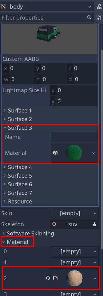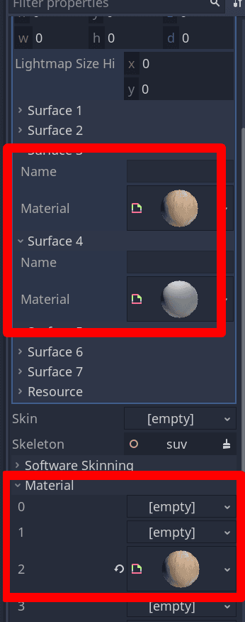 - FIRST: Import a Mesh. In the Mesh Instance, the Mesh child Node has a "Surface" property for each material of the Mesh.