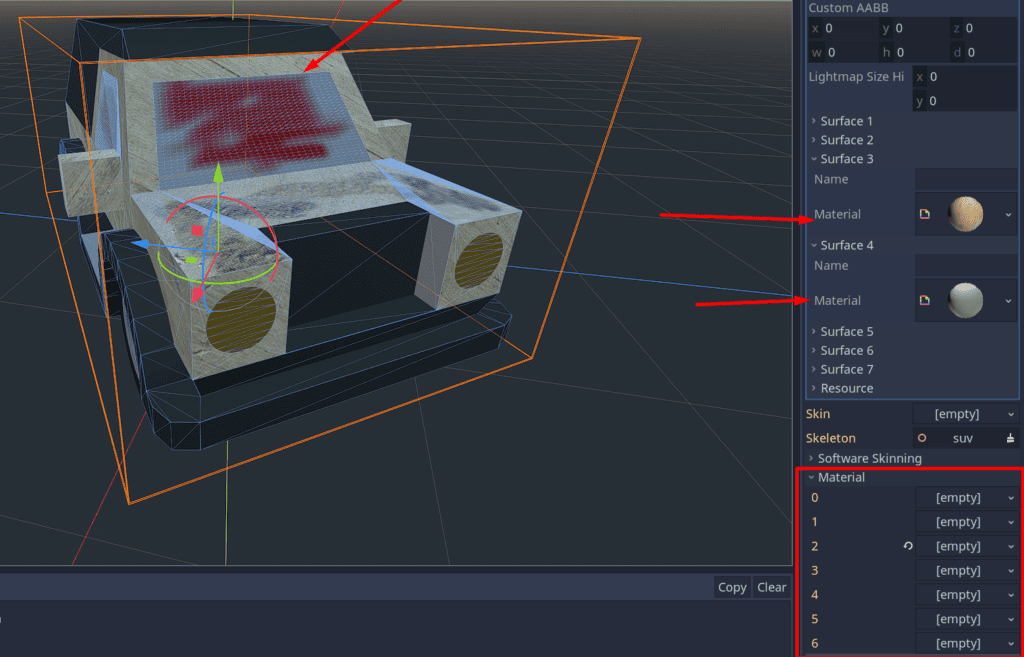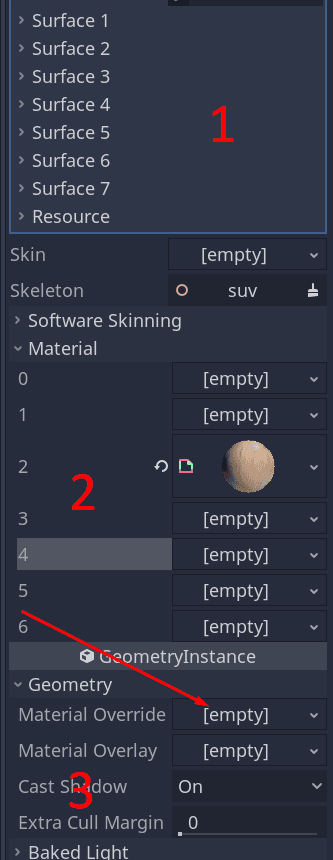 - THIRD: Then the Mesh Instance also has a GeometryInstance resource where you can also set a MaterialOverride, but it has only one spot, not one for each surface.