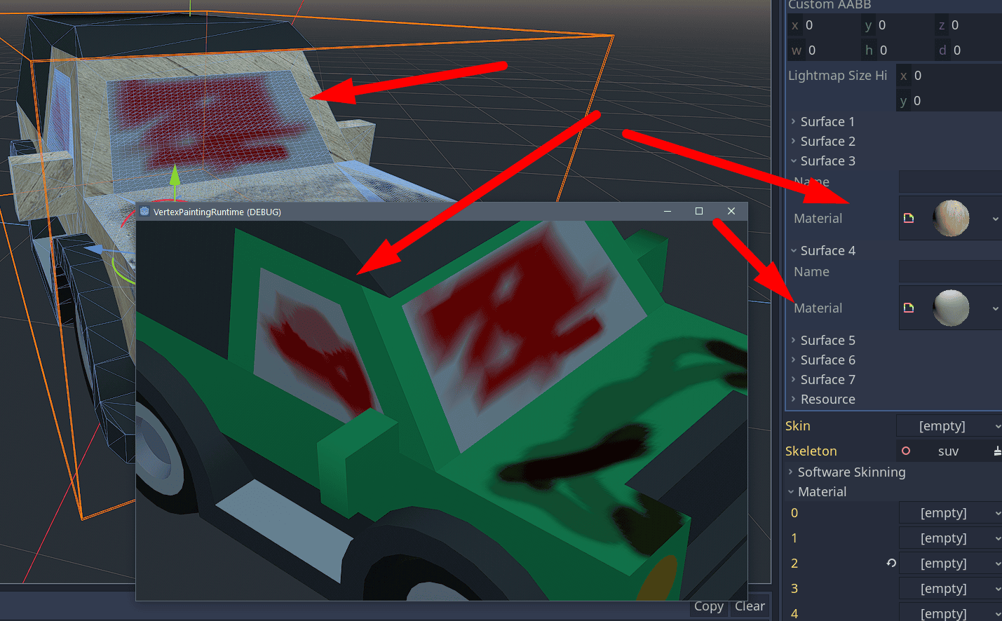 - During runtime, Godot does not know which material is which, and if you assigned materials to different spots, there will be Material's Z-fighting and flickering.