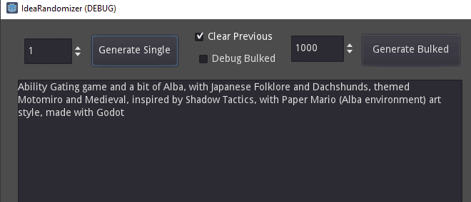 It took me around 10 minutes to throw a very quick and dirty UI and write the logic for the idea generator, with a bunch of data sets with my preferences. After some tweaking, it generated a bunch of ideas that I'm satisfied with. I normally write these as console applications using Elixir or Python, but using Godot allows for a quicker visual iteration. Is it ugly? Yes. Is it adjustable for screen-sizes? Absolutely not. But it got the work done.
