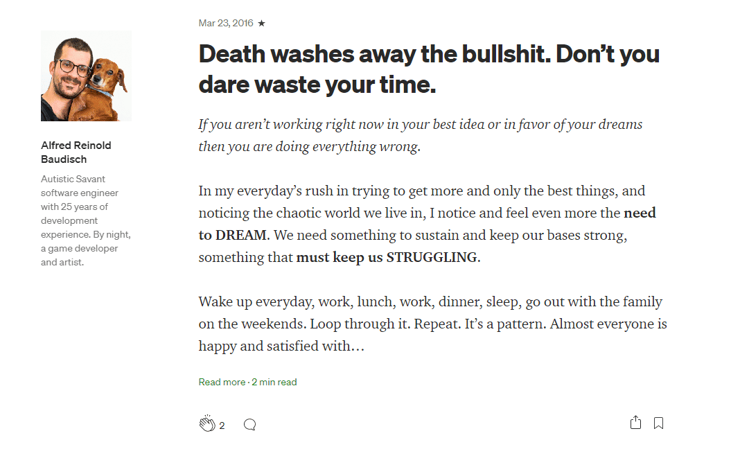 ProjectsEducation Medium August 14, 2021 Updated: August 14, 2021 In my Medium magazine I write about many different subjects, such as Chinese (language), learning techniques, Buddhism, art, fishing and more. Some of my articles have more than 100,000 views, which earned me a spot as a Medium Partner. ← Previous post Aprender Chinês Next post → Make Games Without Programming using Godot