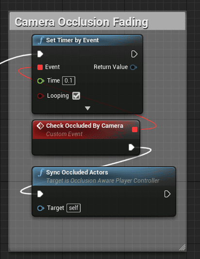 In the Player Controller Blueprint that you created previously (that inherits from OcclusionAwarePlayerController), call Set Timer by Event in the BeginPlay event and call Sync Occluded Actors.